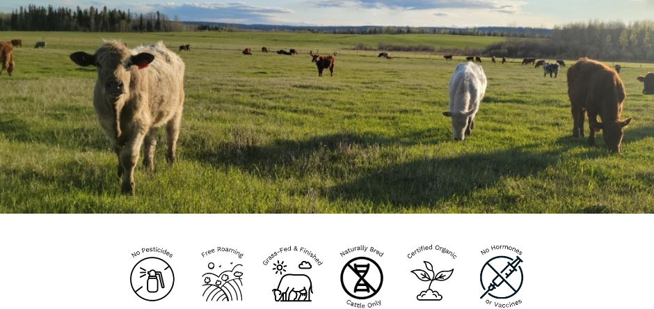 Our cattle are Certified Organic, free-roaming, 100% grass-fed and finished, and raised without hormones, steroids, antibiotics, or vaccines.