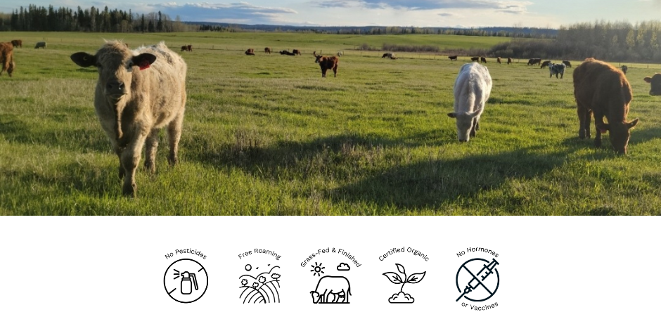Our cattle are Certified Organic, free-roaming, 100% grass-fed and finished, and raised without hormones, steroids, antibiotics, or vaccines.